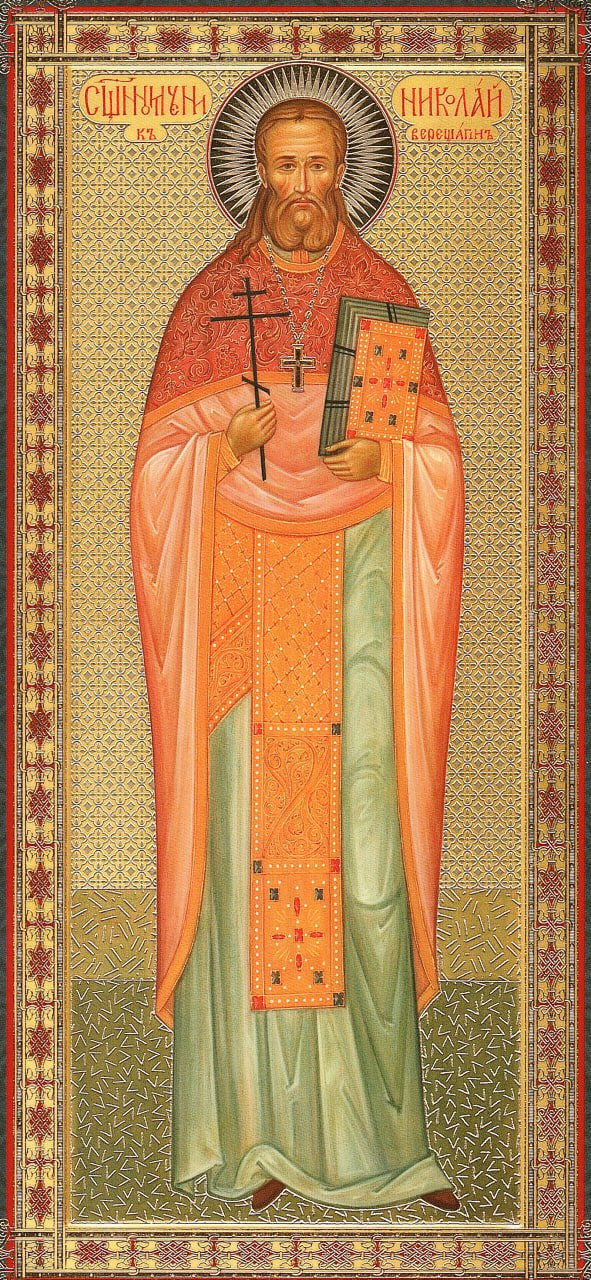 Отец Дамаскин посвятил свою проповедь рассказу о жизненном пути святого мученика. Николай Михайлович Верещагин родился в семье потомственных священнослужителей, род которых ведет начало с начала XVIII века. Его отец так же как и он служили в Богоявленском храме с.Глебово.