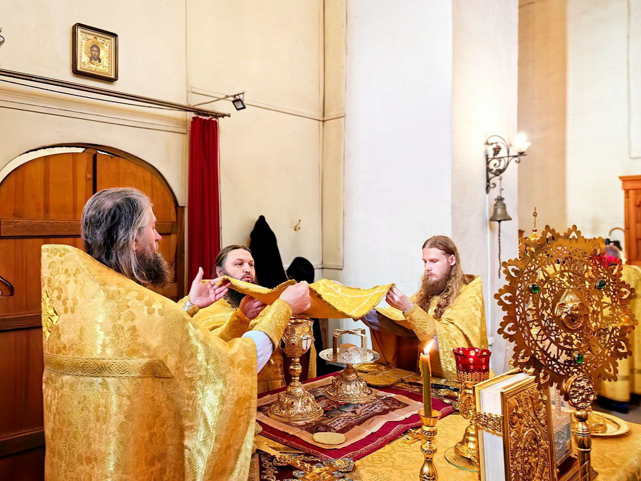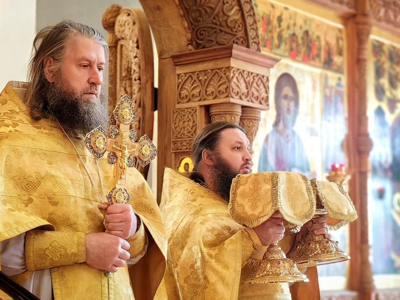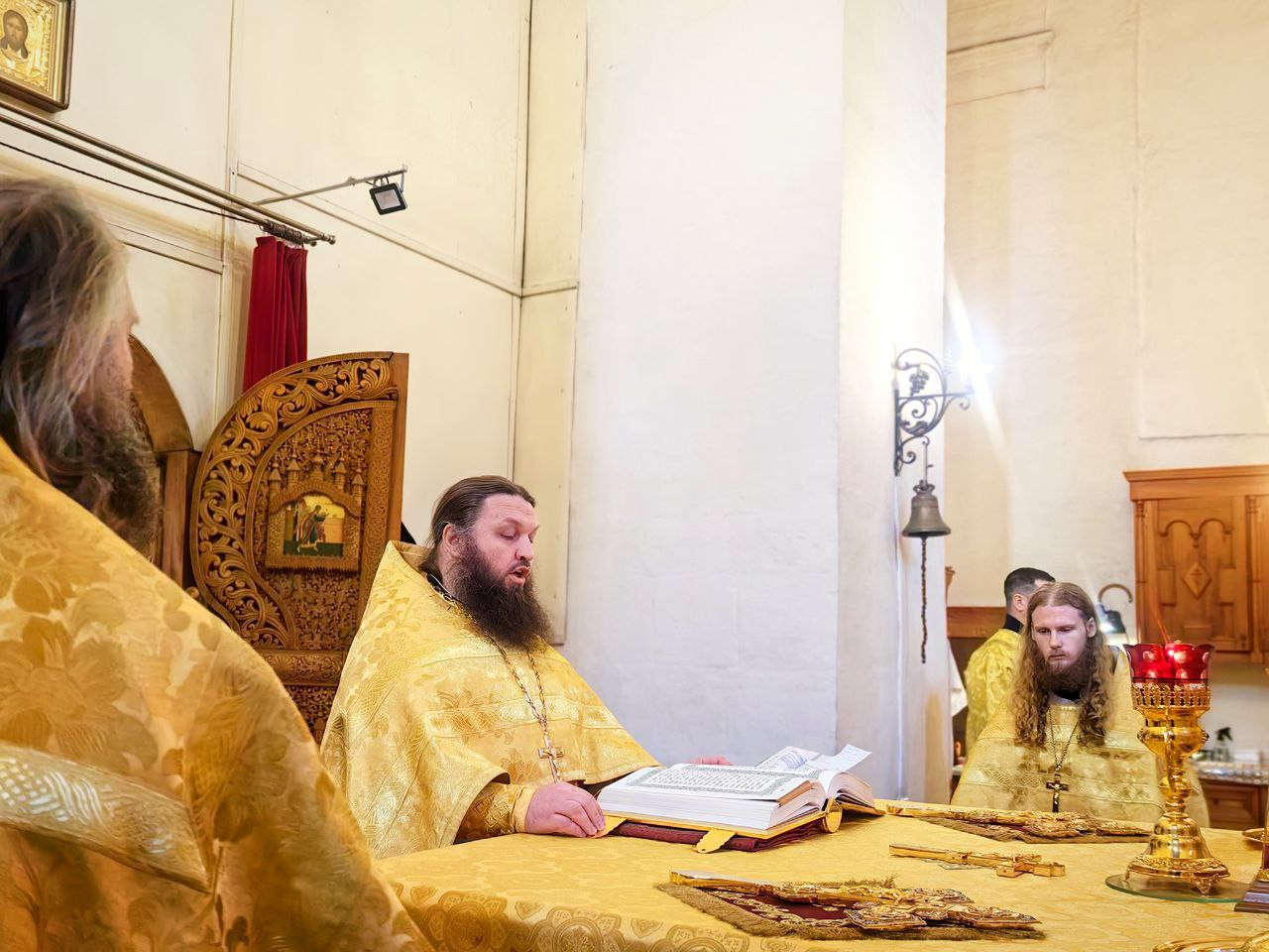 Божественную Литургию в Успенском соборе монатыря совершил наместник обители игумен Дамаскин (Леонов) в сослужении братии монастыря: иеромонаха Нектария (Андреева), иеромонаха Вениамина (Веселова) и иеромонаха Филарета (Гавщука).