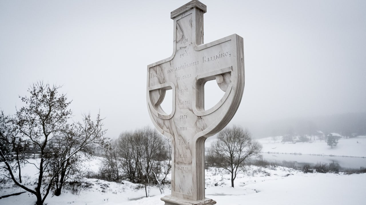 Крест, является копией одного из каменных крестов, поставленных на местных курганах.