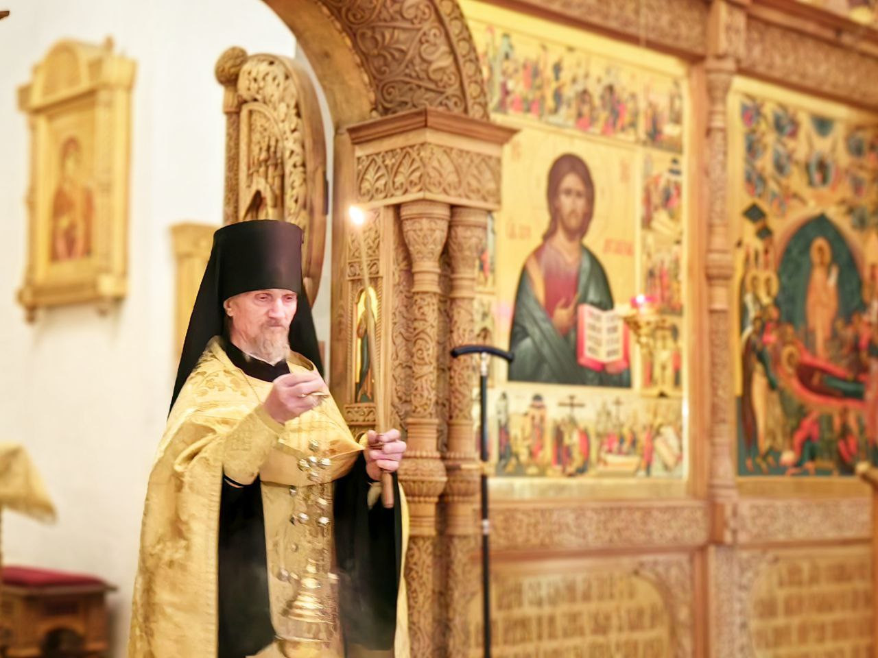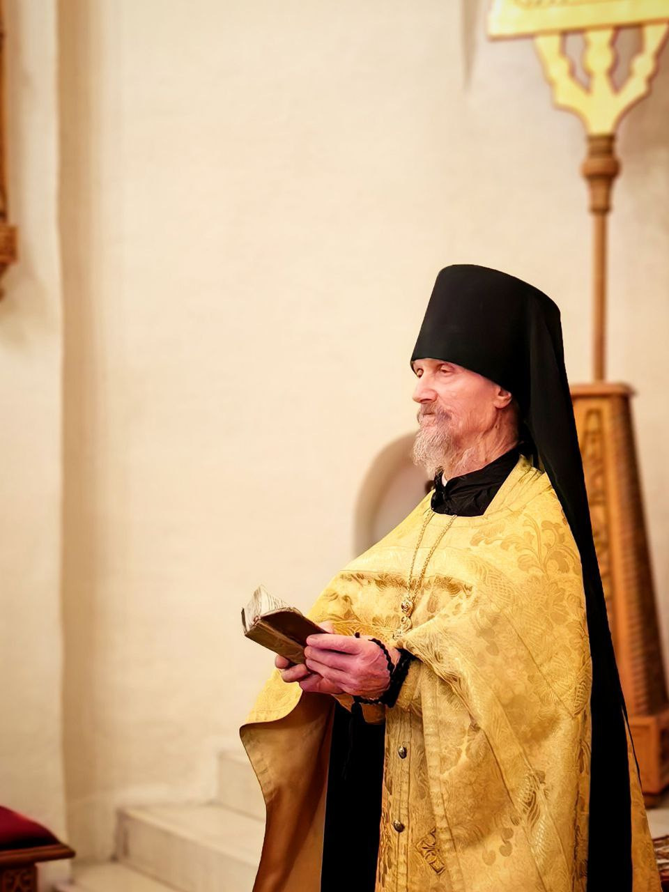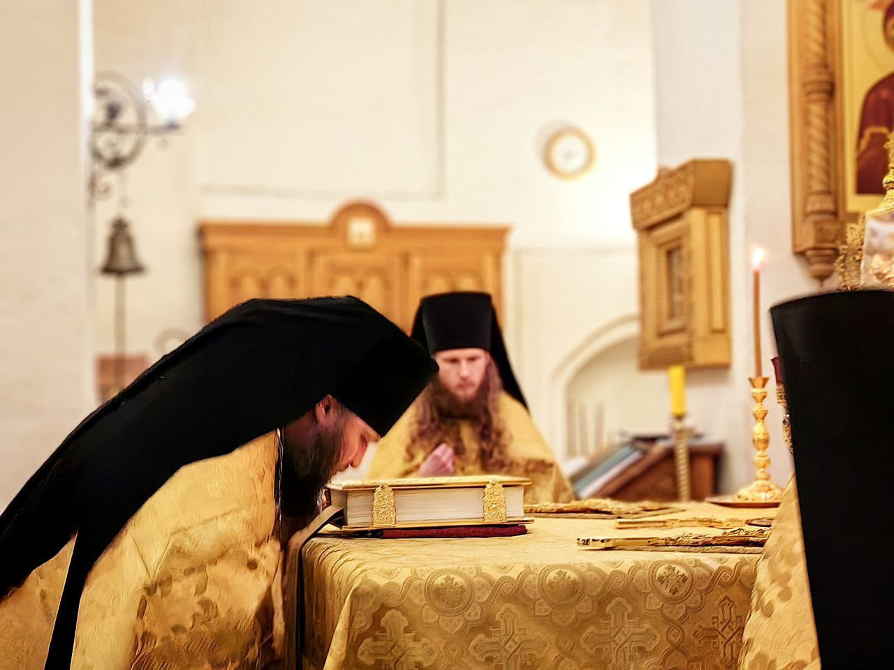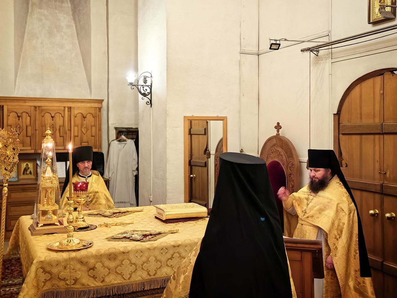 Божественную Литургию в Успенском соборе монастыря совершил наместник обители игумен Дамаскин (Леонов) в сослужении братии монастыря иеромонаха Вениамина (Веселова) и иеромонаха Филарета (Гавщука).