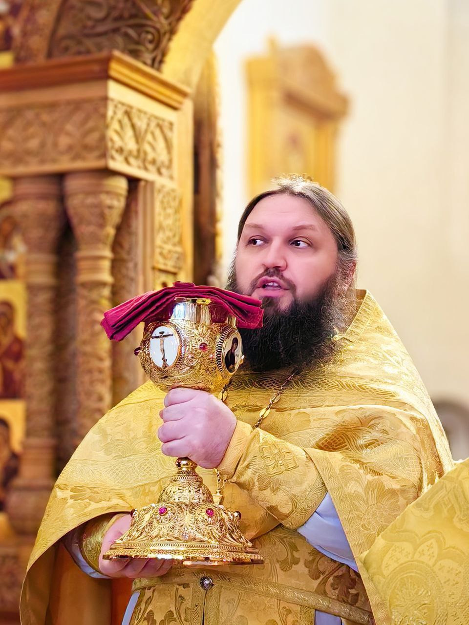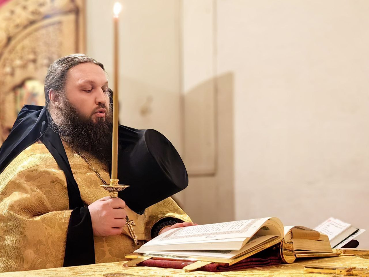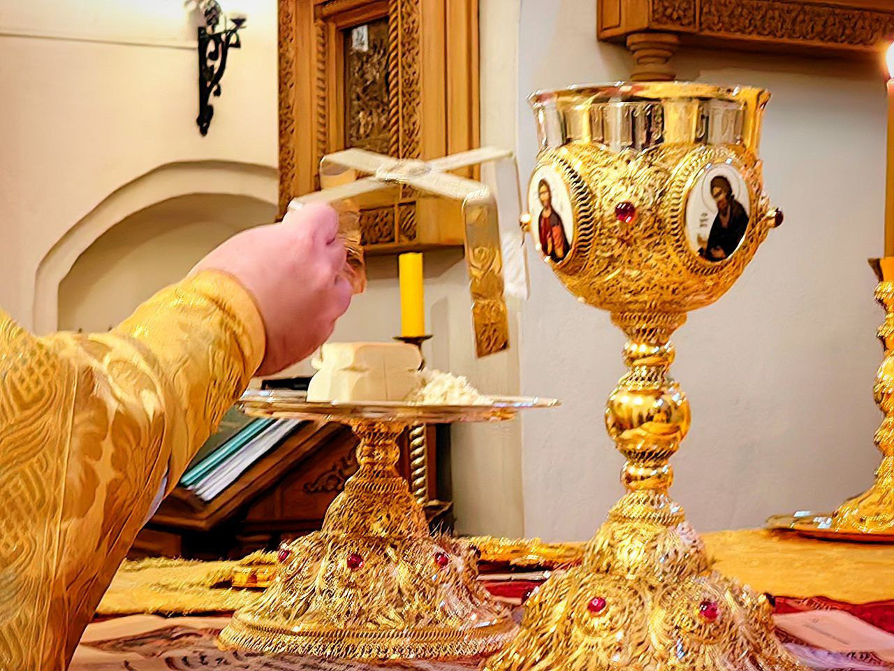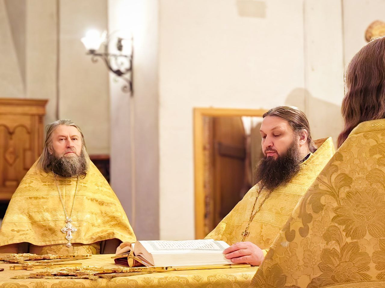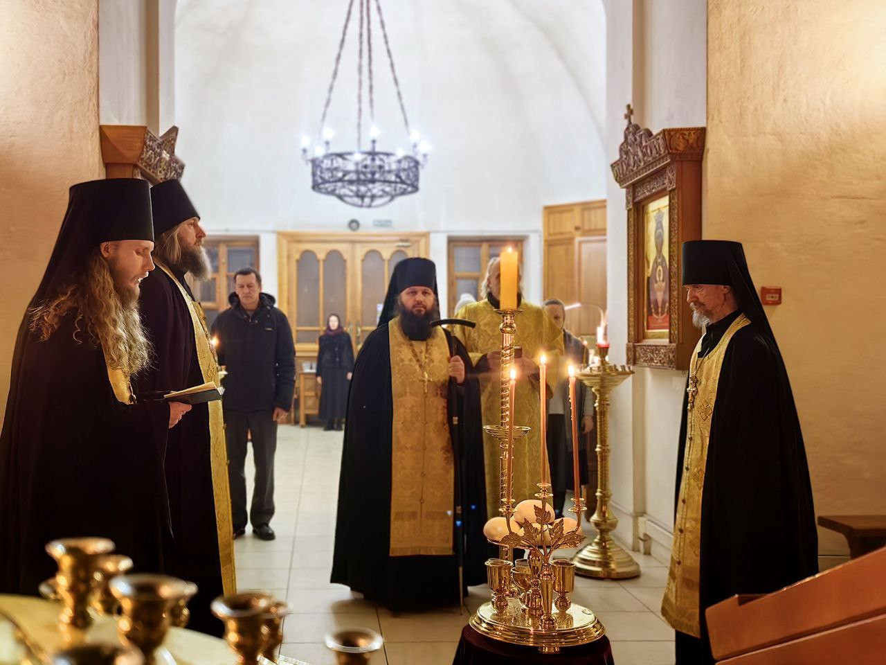 Божественную Литургию вуспенском соборе возглавил наместник обители игумен Дамаскин (Леонов). Ему сослужили братия монастыря иеромонах Нектарий (Андреев), иеромонах Вениамин (Веселов) и иеромонах Филарет (Гавщук).