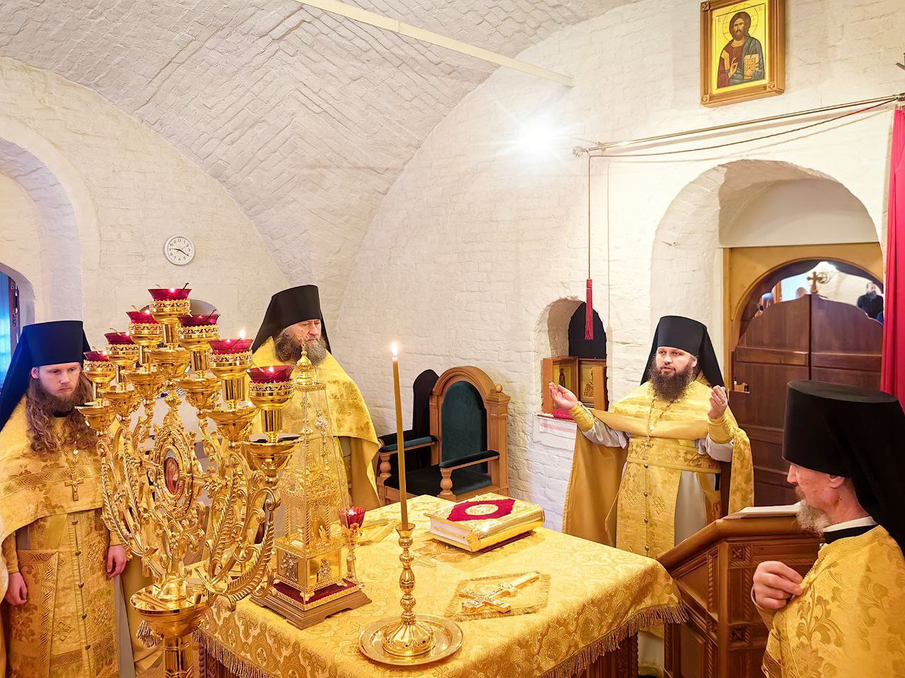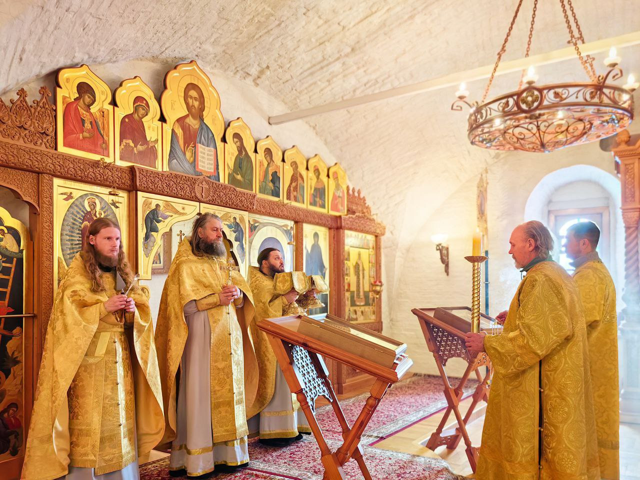 Божественную Литургию в приделе святителя Иова Введенской церкви обители совершил наместник монастыря игумен Дамаскин (Леонов) в сослужении братии монастыря иеромонаха Нектария (Андреева), иеромонаха Вениамина (Веселова) и иеромонаха Филарета (Гавщука).