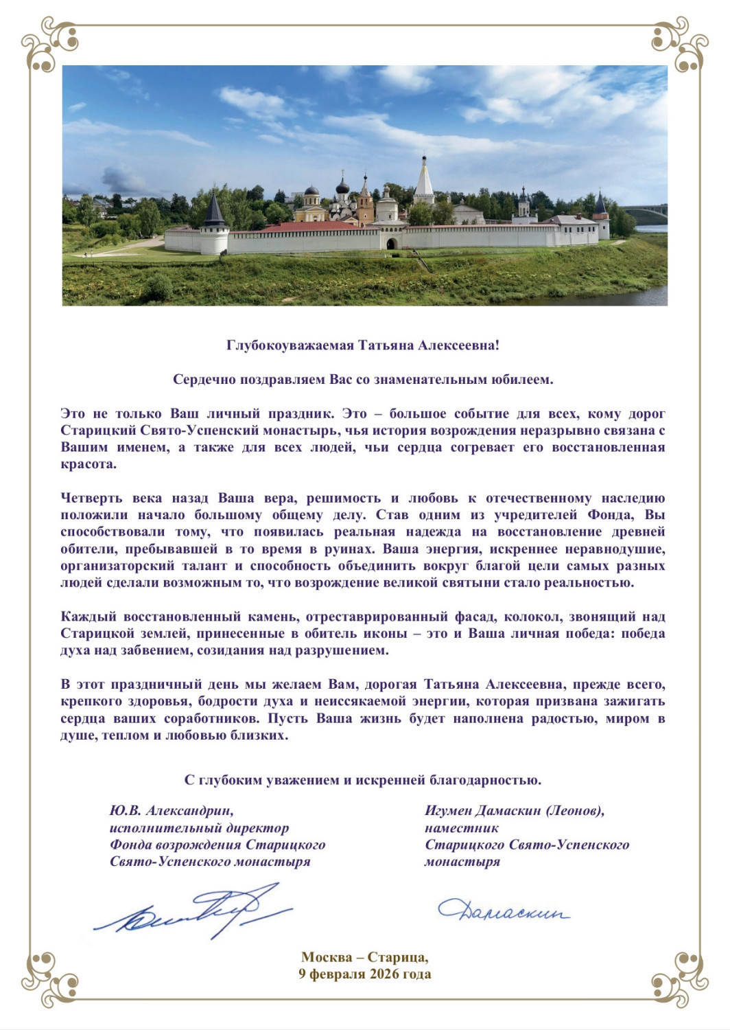 Братия обители и Фонд возрождения Старицкого монастыря сердечно поздравляют Татьяну Алексеевну с праздничной датой и присоединяются к многочисленным поздравлениям и пожеланиям!!