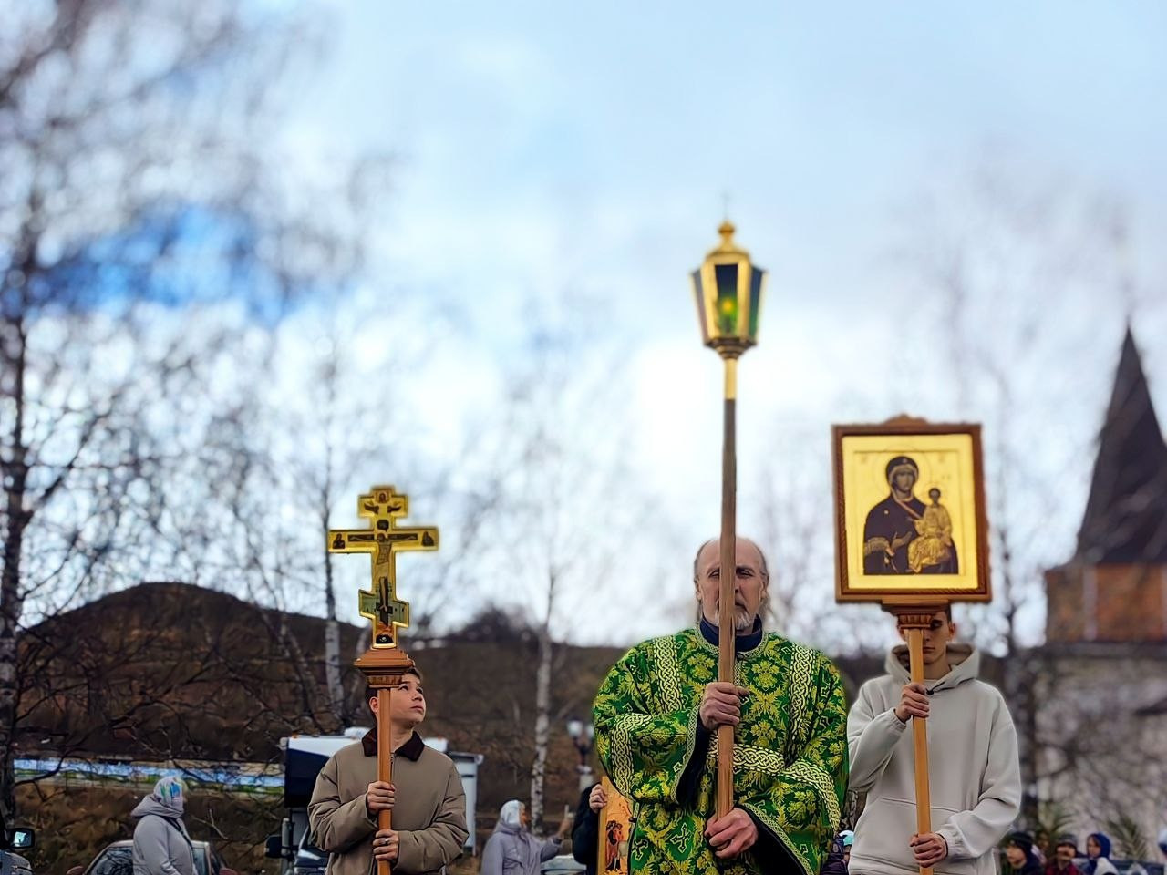 По окончании Литургии вокруг монастыря был совершен традиционный крестный ход в котором приняли участие дети, воспитанники центра "Образ", прихожане и паломники обители.